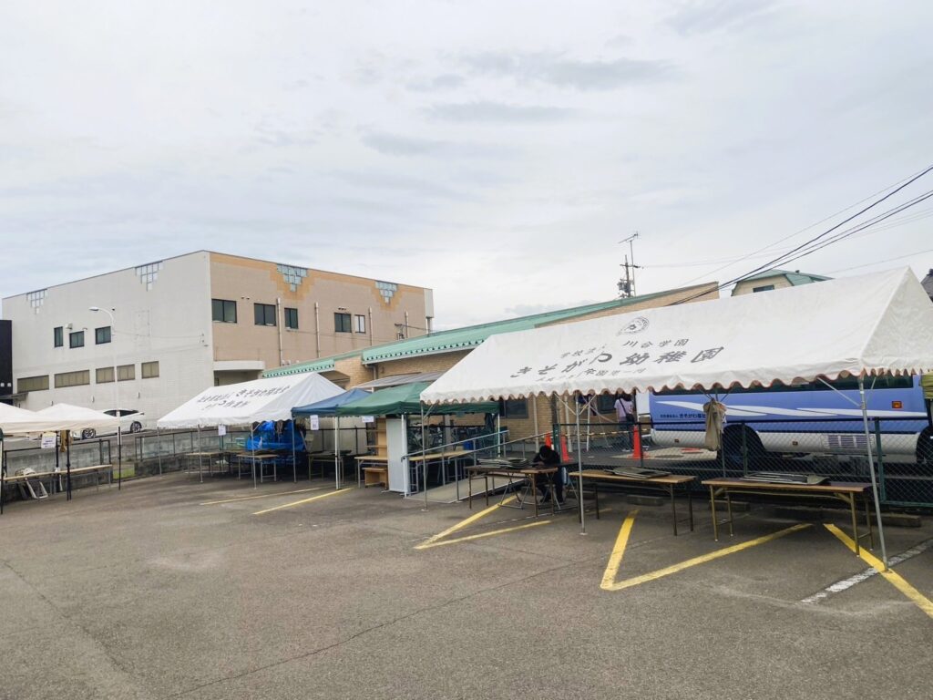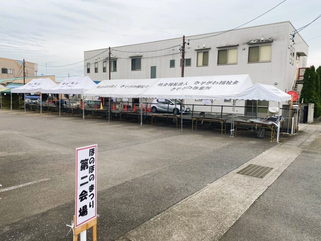 第二会場では、飲食店の出張販売コーナー・近隣の福祉施設のお店・ボッチャ体験コーナー、ゲームコーナー、キッチンカー、震災支援コーナー等々各ブースのテントがたくさん並んで皆様のご来場をお待ちしております。