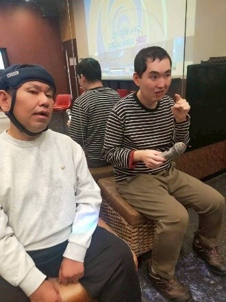 グループの仲間と行くカラオケは初めてだったので、始めは緊張して少し遠慮した歌い方でしたが、しばらくすると緊張もほぐれてリラックスしていたように思います。アニソン、戦隊系、お母さんといっしょの曲、演歌など好きな歌や十八番を沢山歌う事ができました。ある利用者さんは職員とデュエットをしてくれて盛り上がりました‼