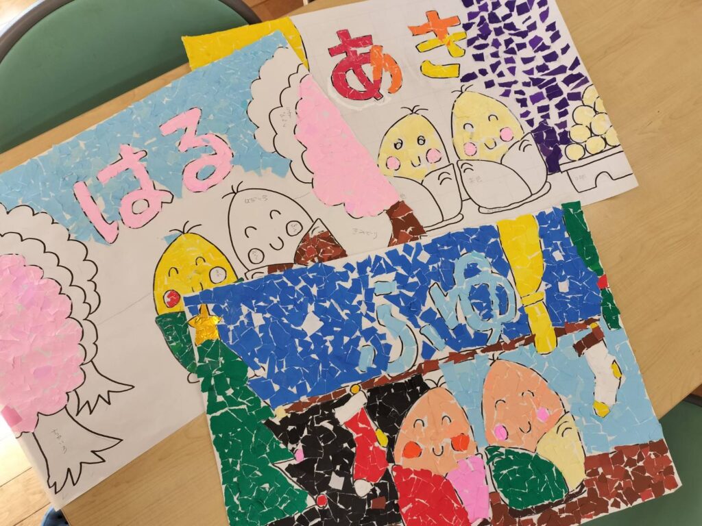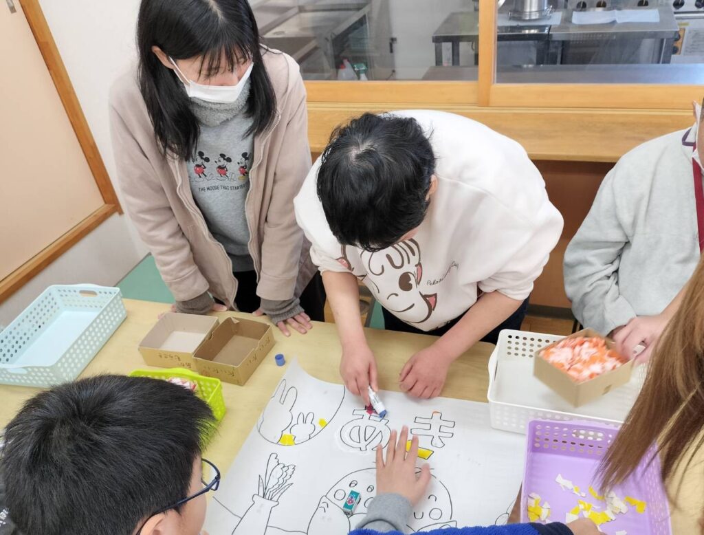 上手に貼り絵を貼る仲間を見て、「すごい!」との声や上手に貼るにはどうやったらいいか聞いている子もいました。時間内には完成することはできませんでしたが、残りの作業は後日、仲間が行い、年度内には参加者の小学生の手に完成したものが渡るようにしていきたいと思います。