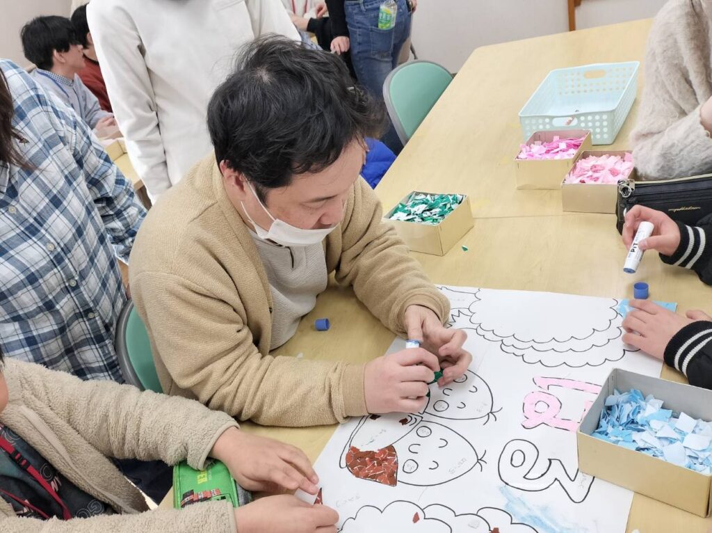 その後、アイスブレーキングとして仲間と小学生でゲームをして緊張をほぐし、仲間たちのお仕事のはり絵(ちぎり絵)でカレンダー作りにとりかかりました。最初は仲間も緊張した表情でしたが、一緒に貼り絵作業をしていくうちに笑顔も見られるようになりました。