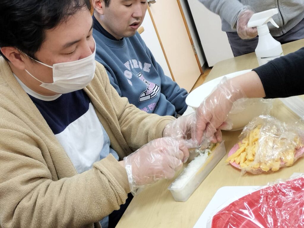 巻きずしを作る型にすし飯を入れる時、難しくてなかなかできない仲間もいましたが、みんなで協力している様子が見られました。