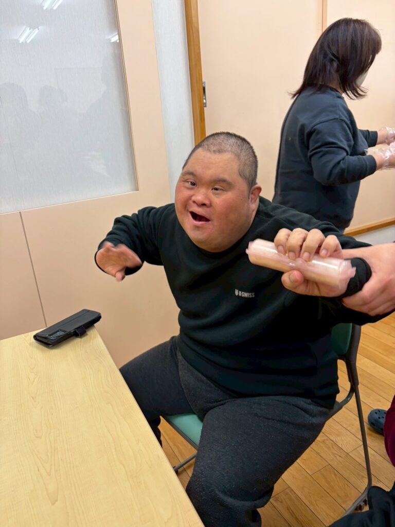 Aグループはきゅうりと玉子の巻きずし、Bグループはツナマヨの巻きずし、Cグループはネギトロ巻きをそれぞれのグループで仲間と職員が協力して作りました。
