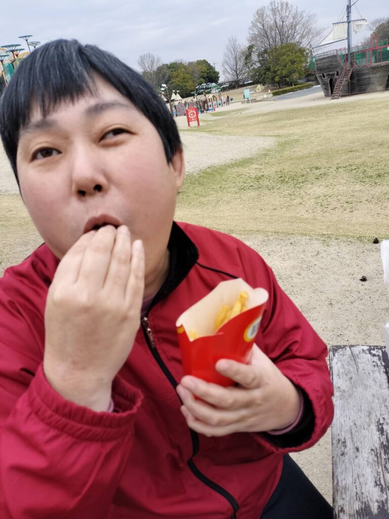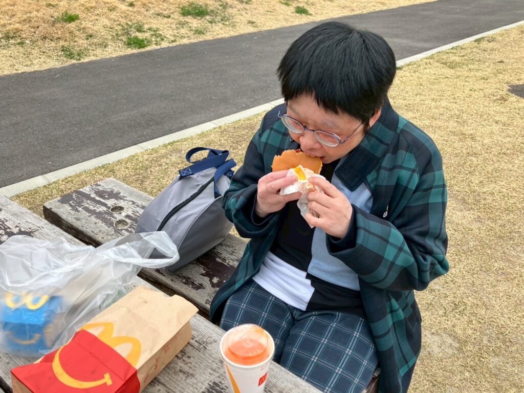 昼食はマクドナルドをテイクアウトし、祖父江緑地公園のベンチに座って食べました。