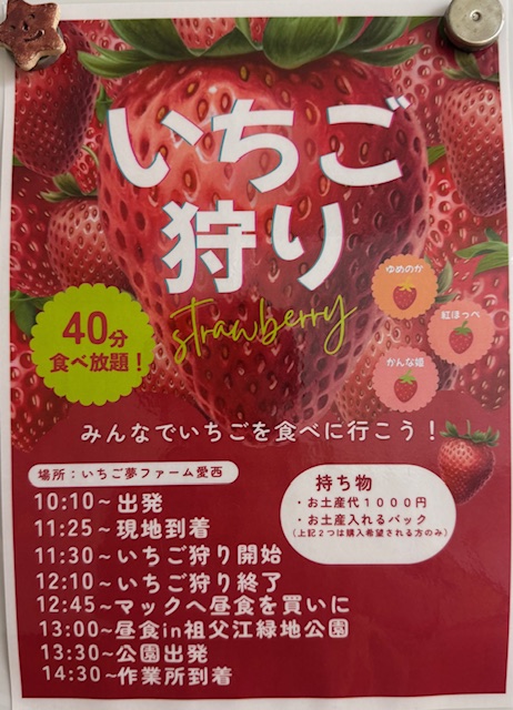 いちご狩りをほぼ全員が初めての経験と言うことで、「いちごを4個食べる!」と楽しみにしてくれている仲間の声が印象的でした。